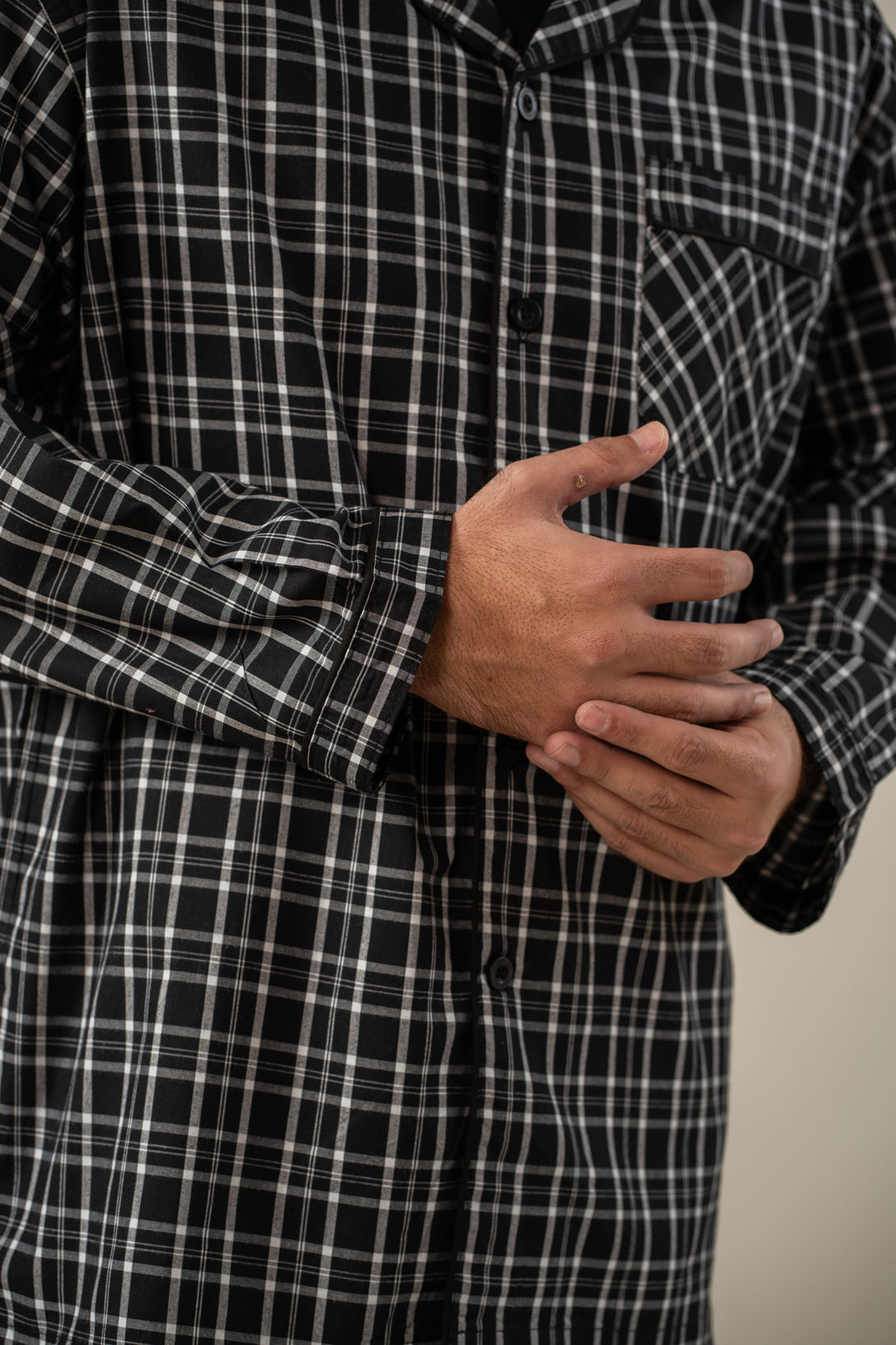 - Full-sleeved button-down top with notched/revere collar for a classic look