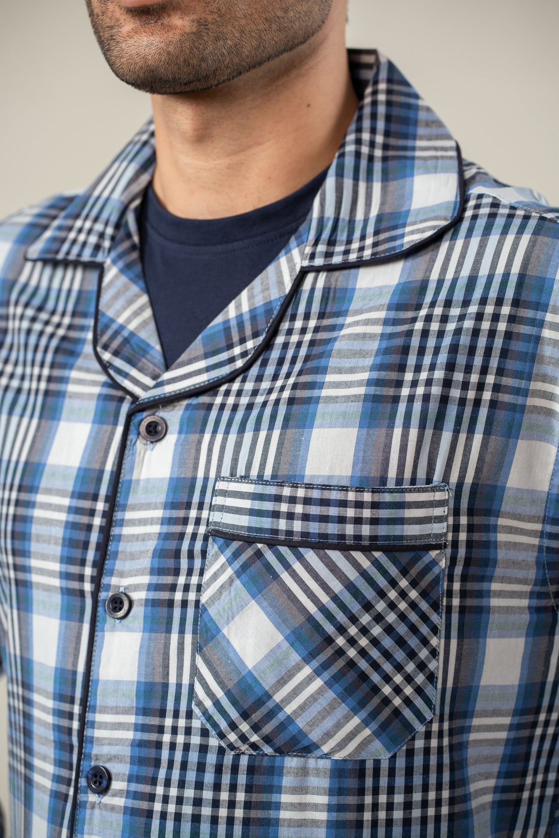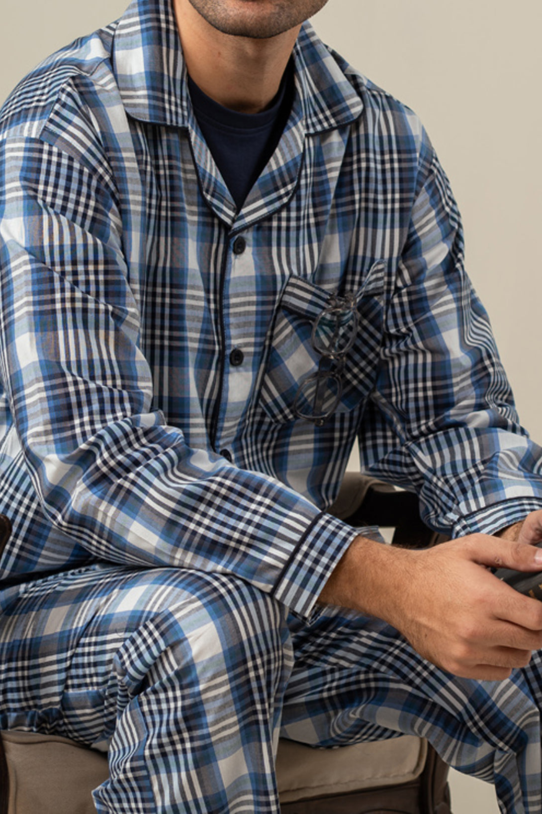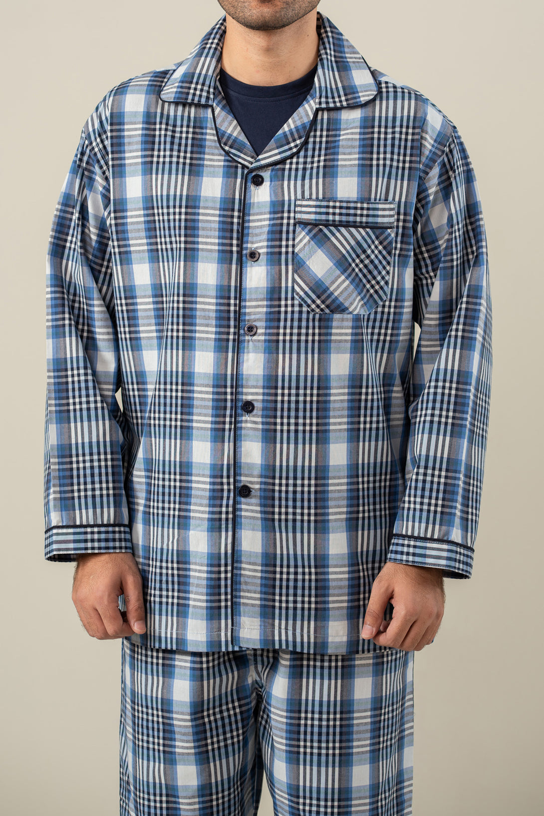 - Men's two-piece pajama set crafted from a soft cotton-poly blend for comfort and durability