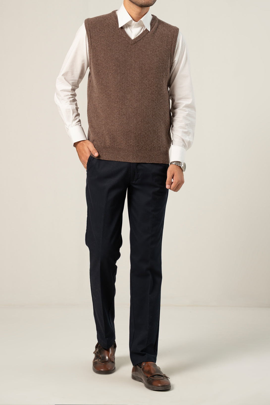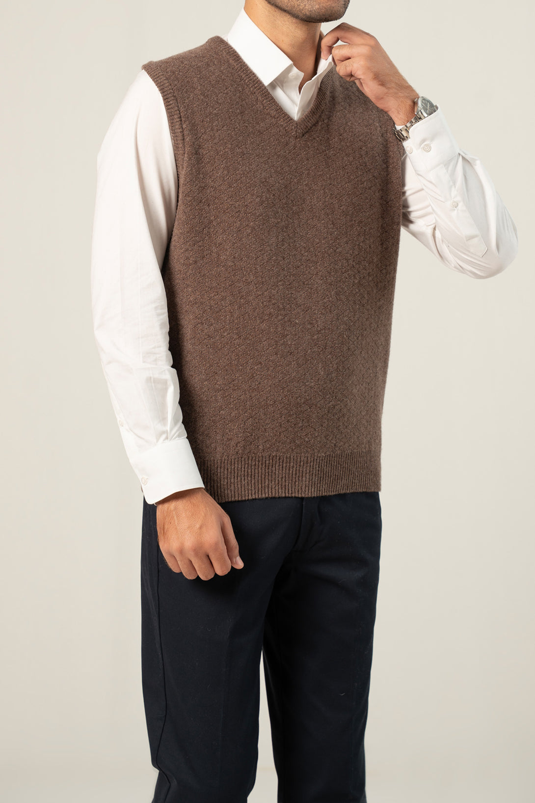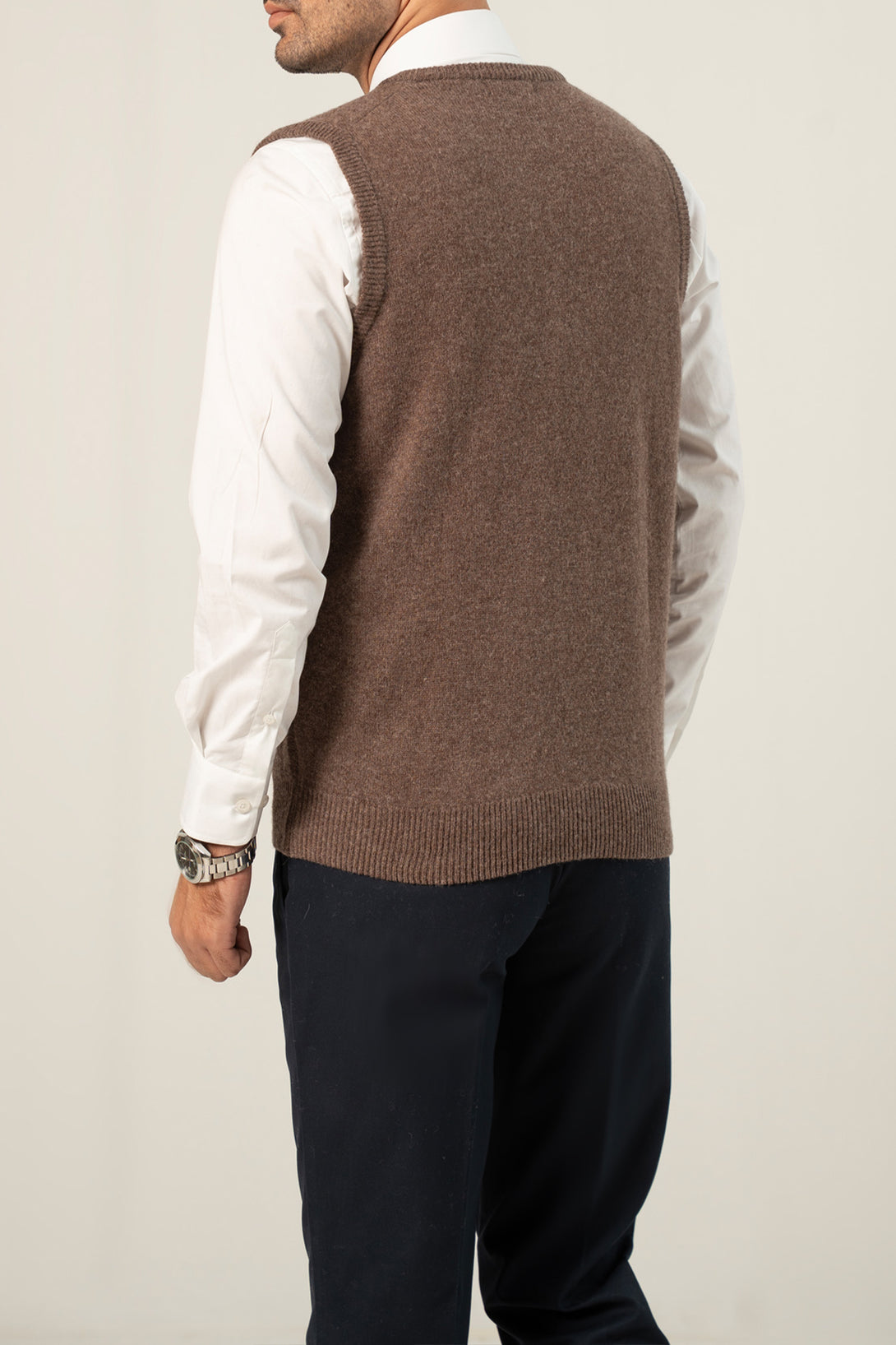 - Classic V-neck design with a sleeveless cut