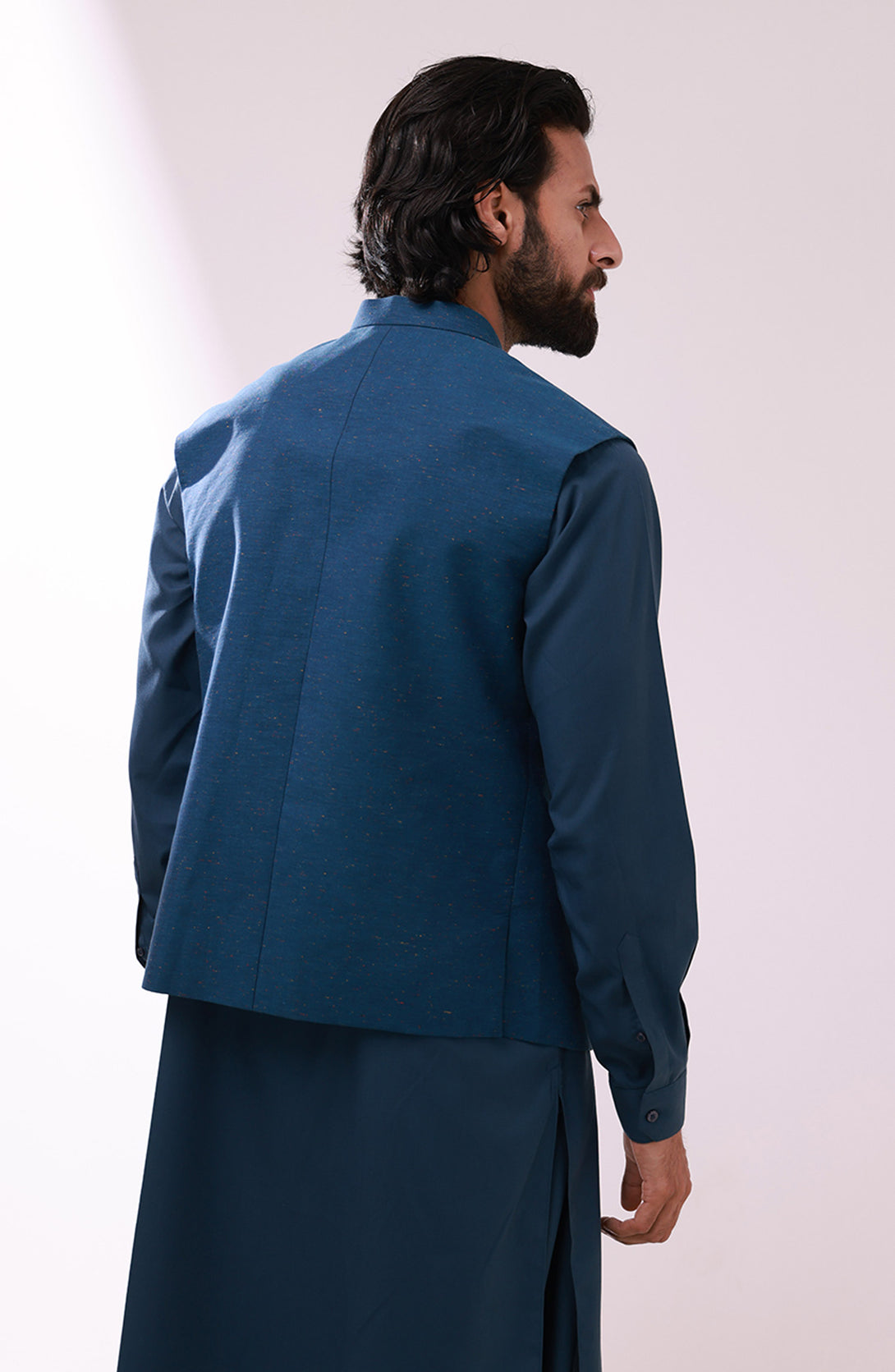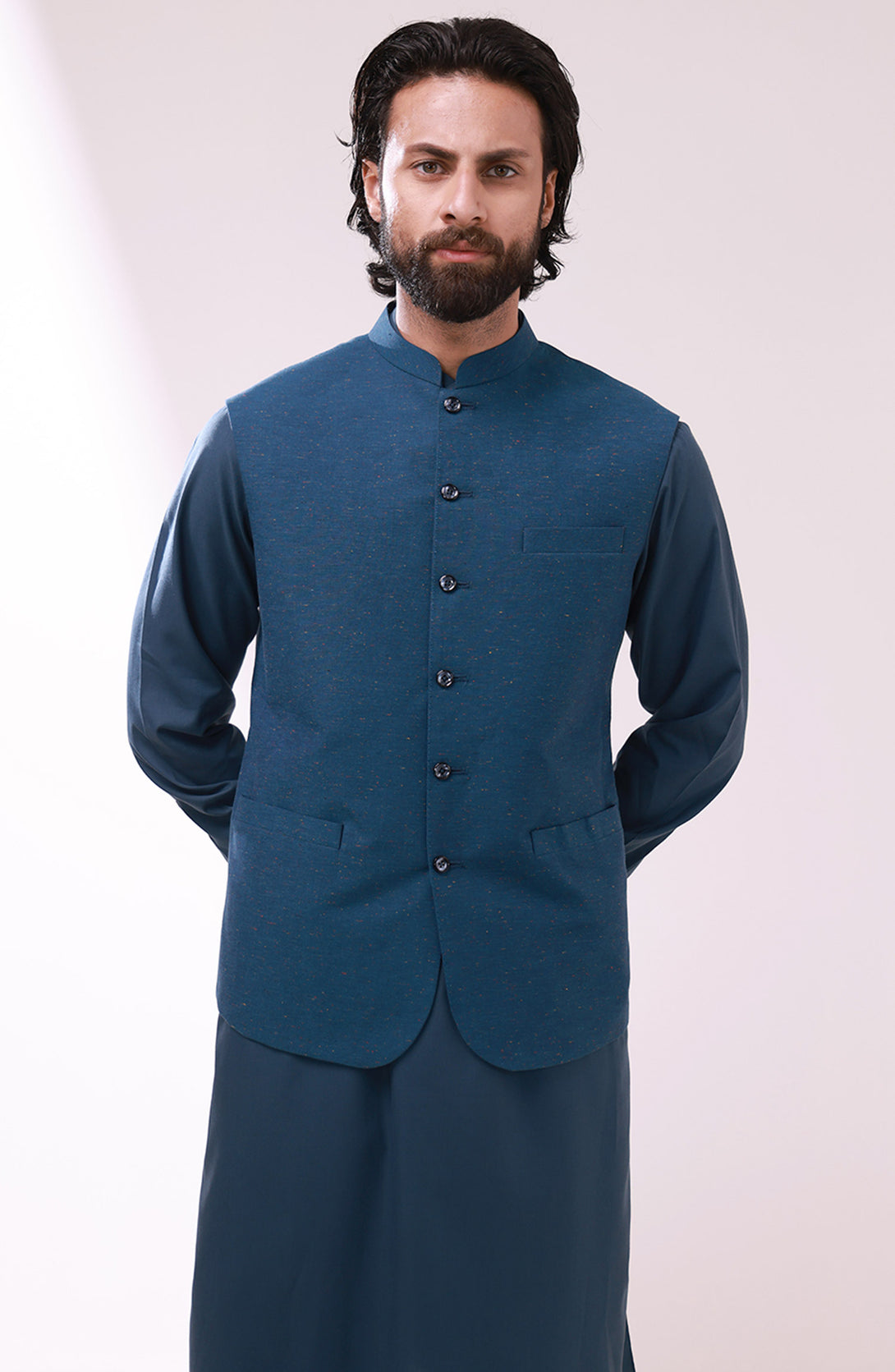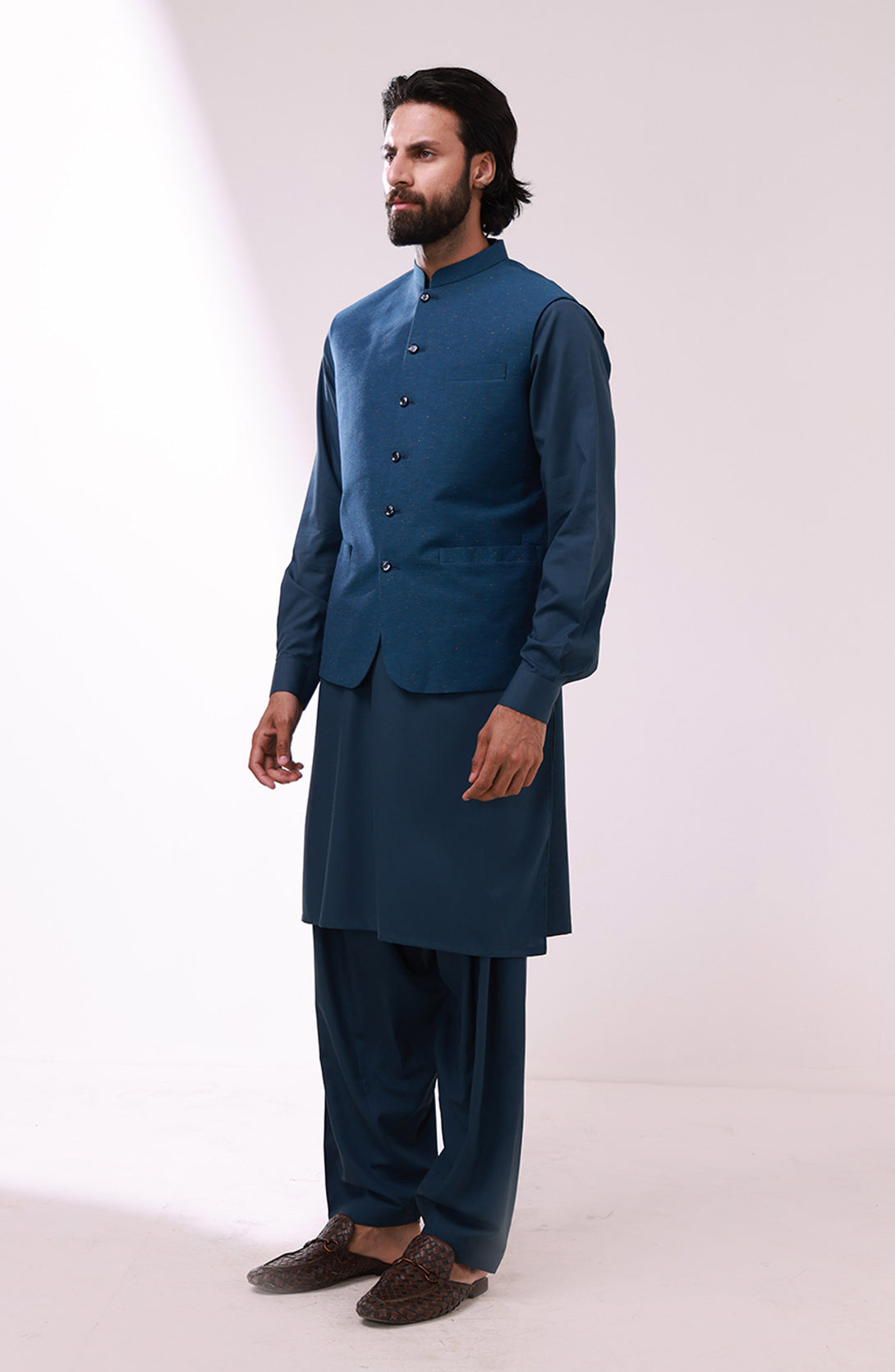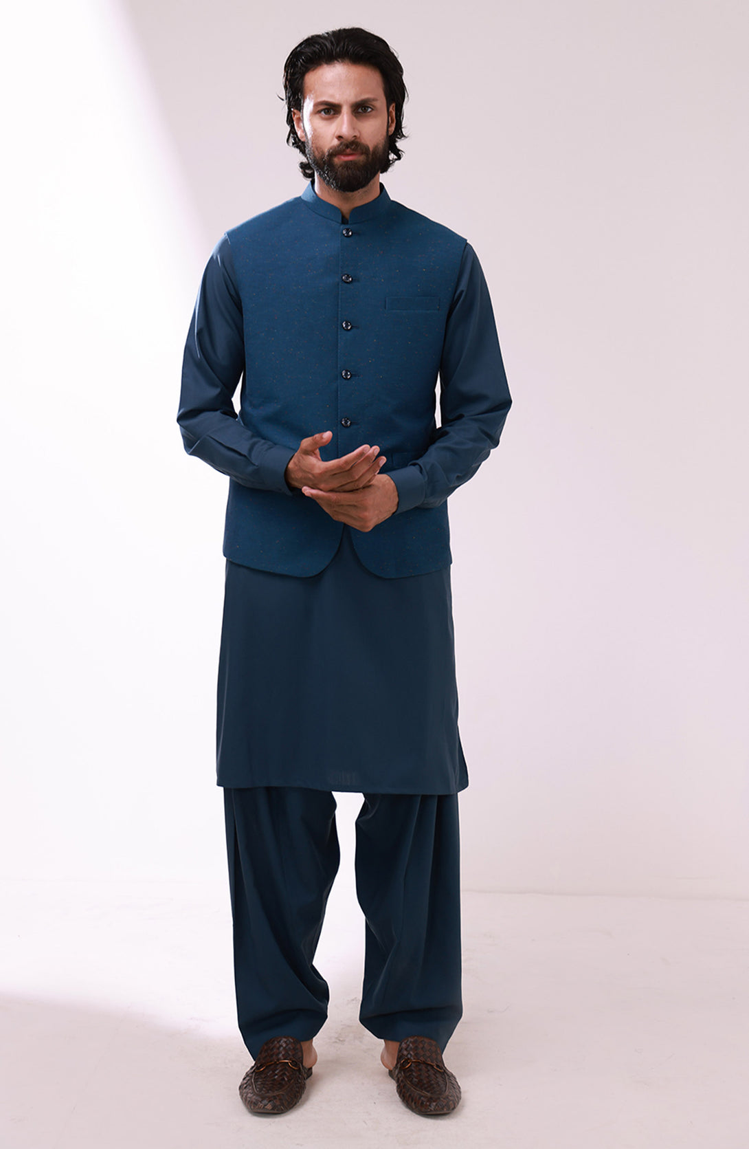 Elevate your style and embrace cultural elegance with this exquisite men's combo suit, featuring a band collar and Burton placket style waistcoat paired with a full-sleeved shalwar kameez. The rich colors and intricate detailing of the shalwar kameez beautifully complement the sleek silhouette of the suit, exuding confidence and sophistication to ensure you stand out in the crowd at special gatherings, festive celebrations, or formal events.