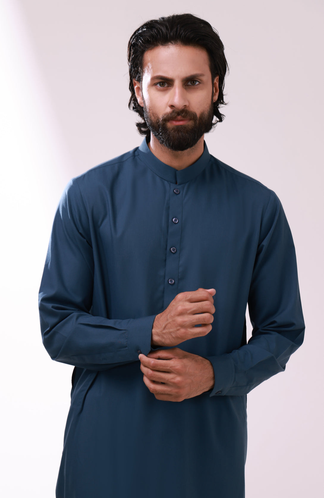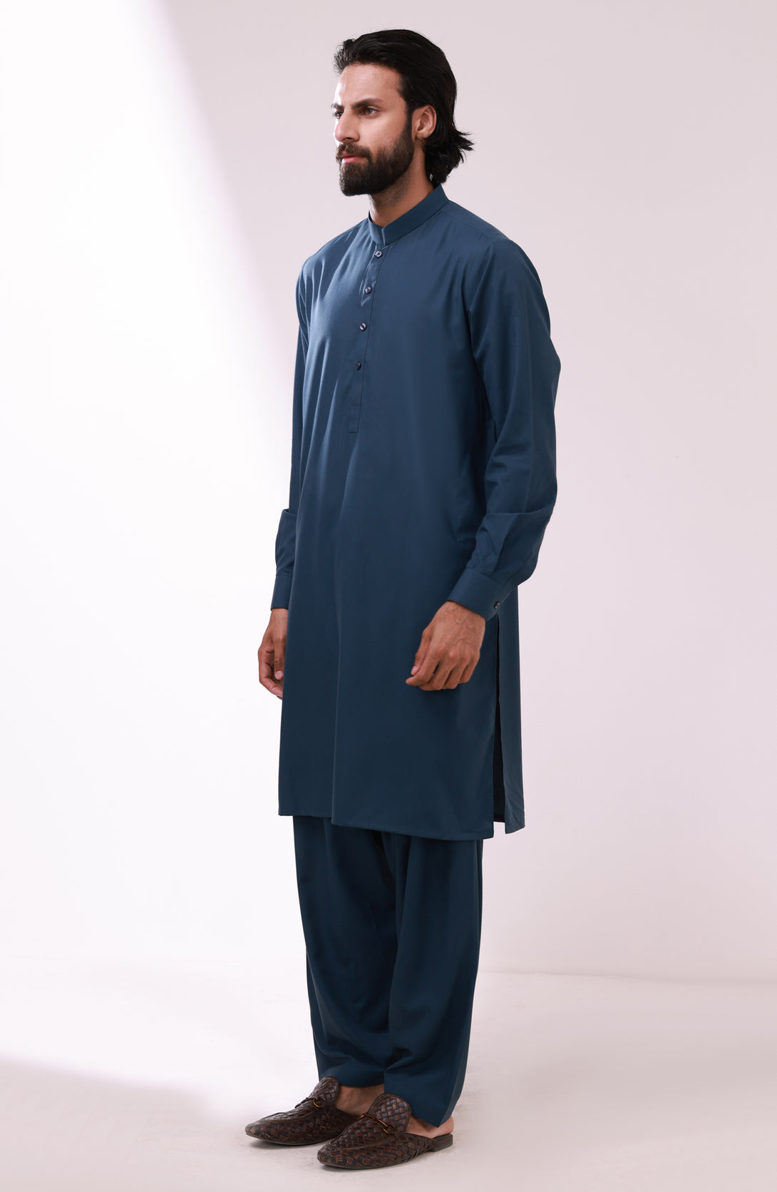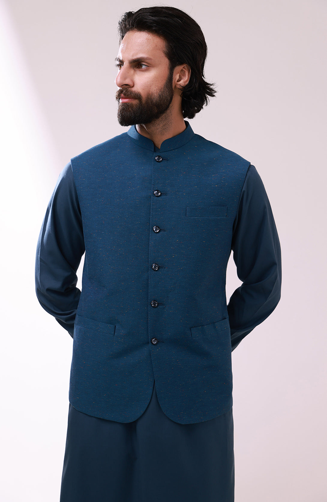 Elevate your style and embrace cultural elegance with this exquisite men's combo suit, featuring a band collar and Burton placket style waistcoat paired with a full-sleeved shalwar kameez. The rich colors and intricate detailing of the shalwar kameez beautifully complement the sleek silhouette of the suit, exuding confidence and sophistication to ensure you stand out in the crowd at special gatherings, festive celebrations, or formal events.