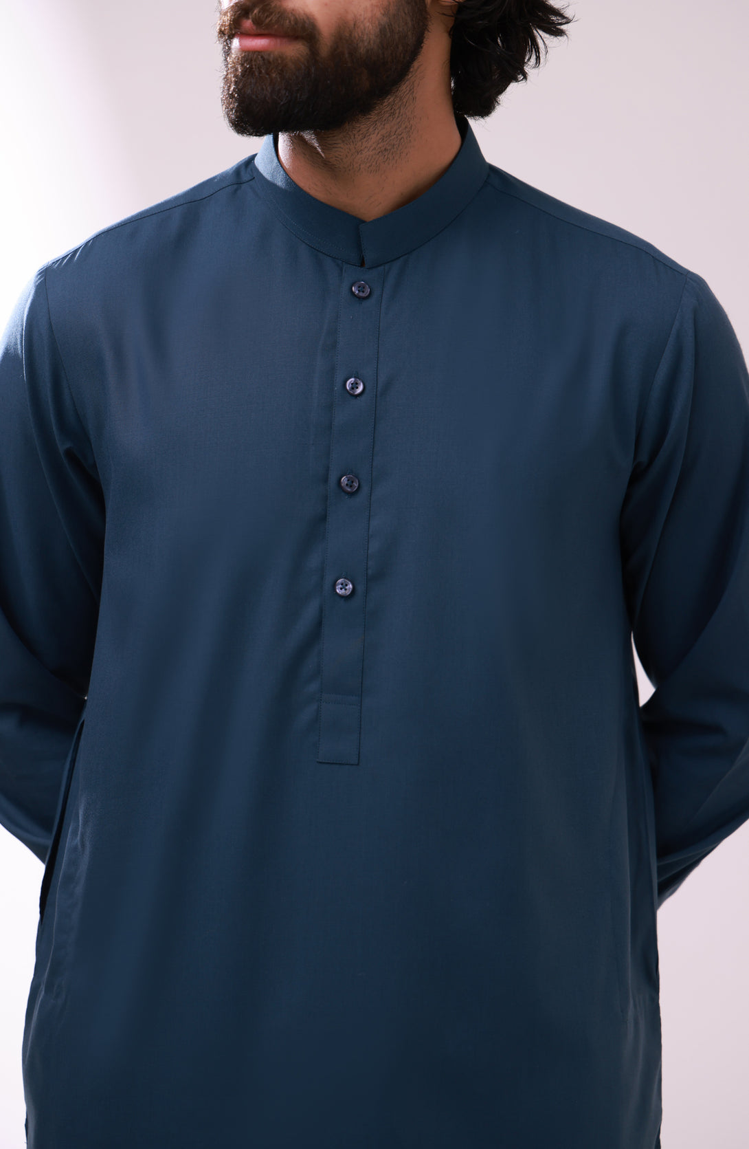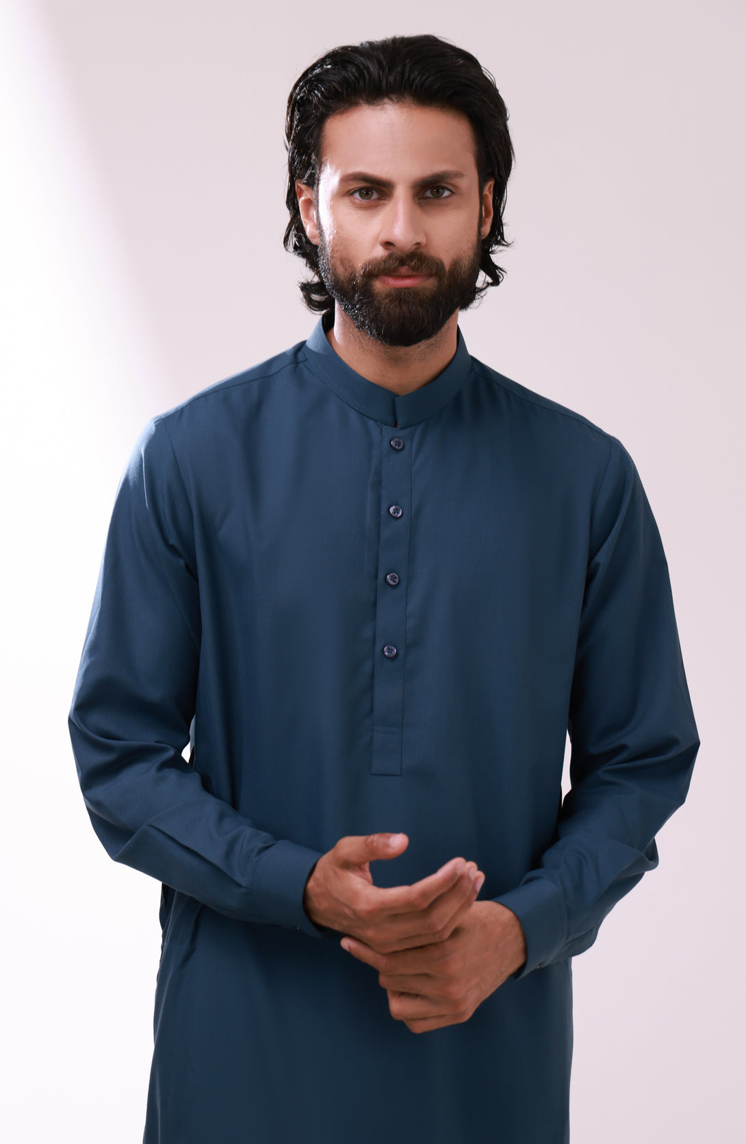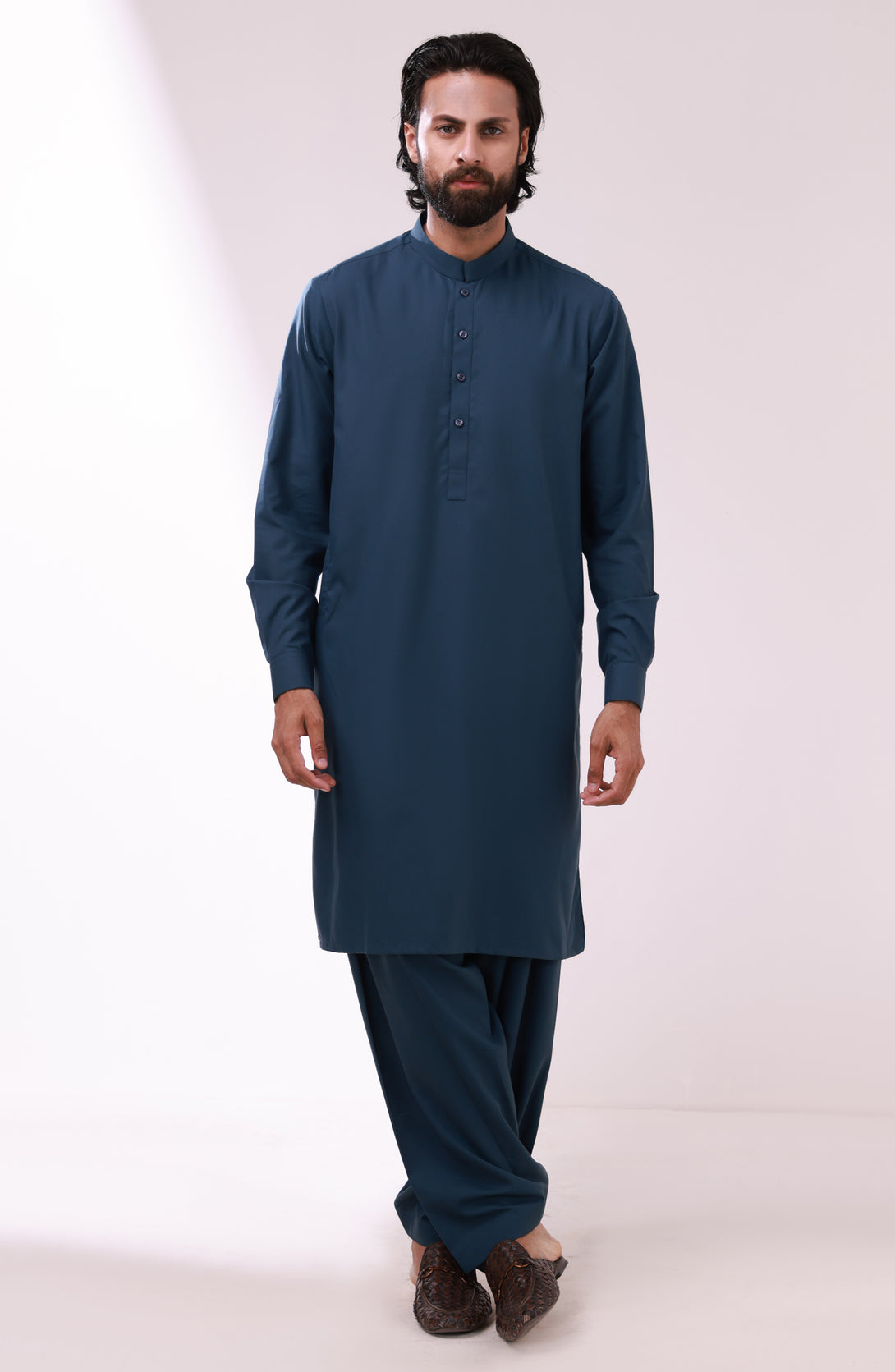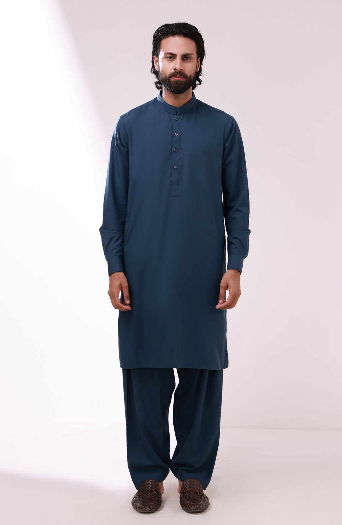 Elevate your style and embrace cultural elegance with this exquisite men's combo suit, featuring a band collar and Burton placket style waistcoat paired with a full-sleeved shalwar kameez. The rich colors and intricate detailing of the shalwar kameez beautifully complement the sleek silhouette of the suit, exuding confidence and sophistication to ensure you stand out in the crowd at special gatherings, festive celebrations, or formal events.