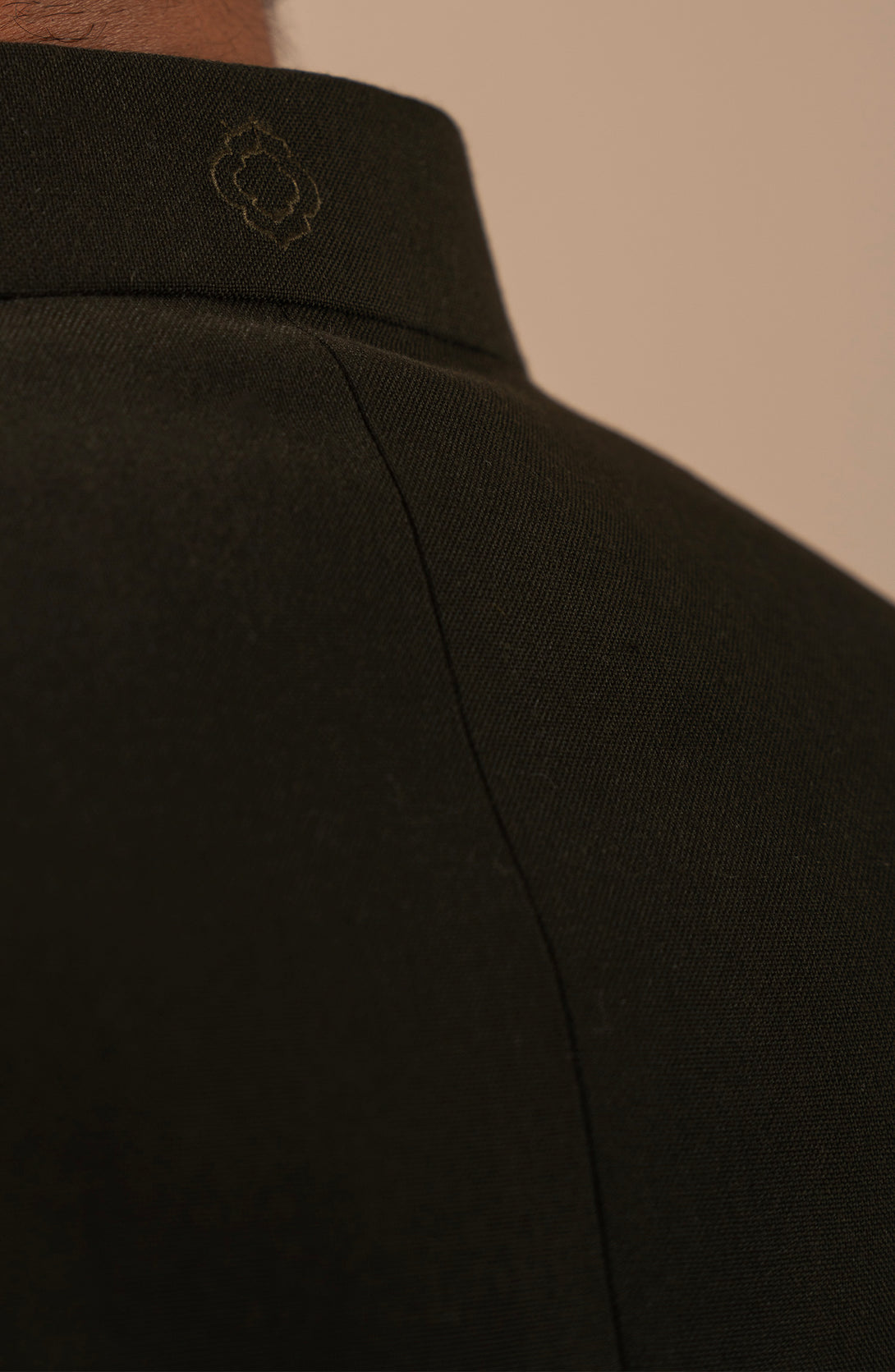 Band collar and cut line hem offer a sharp, contemporary touch.