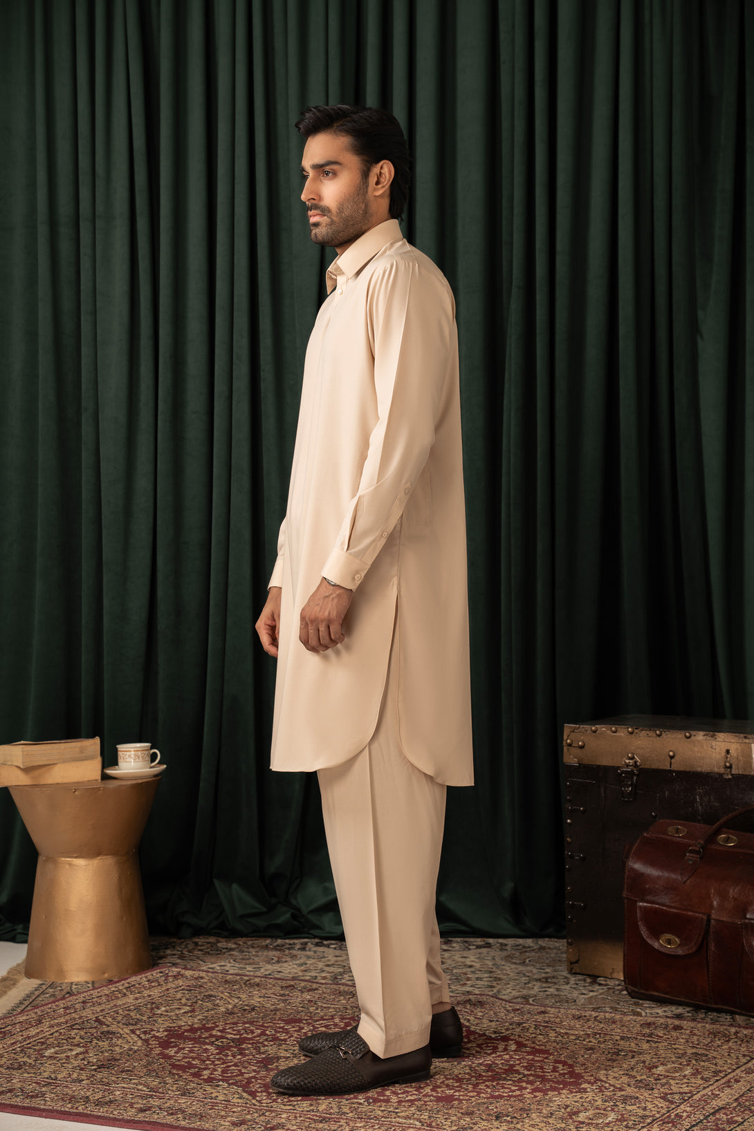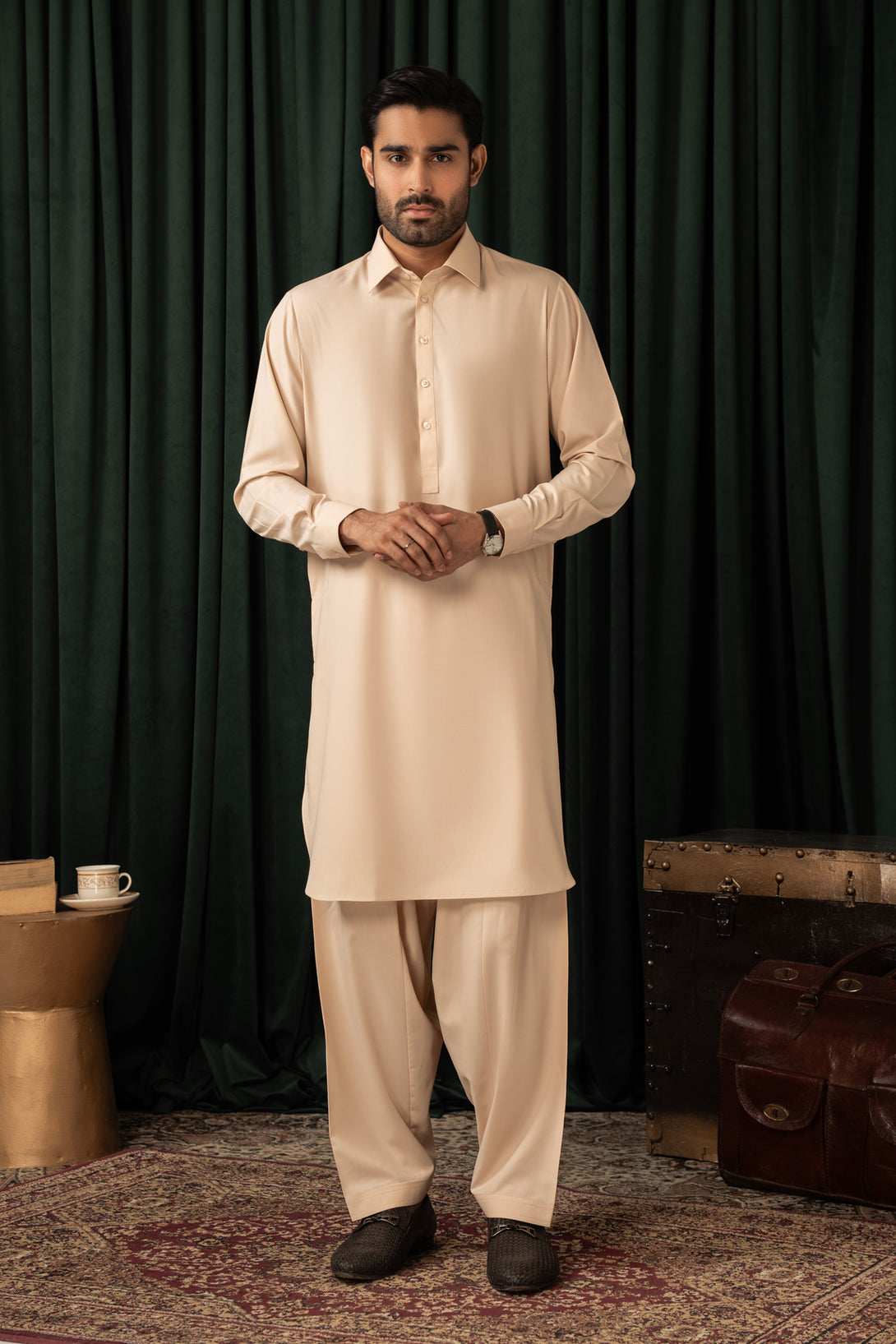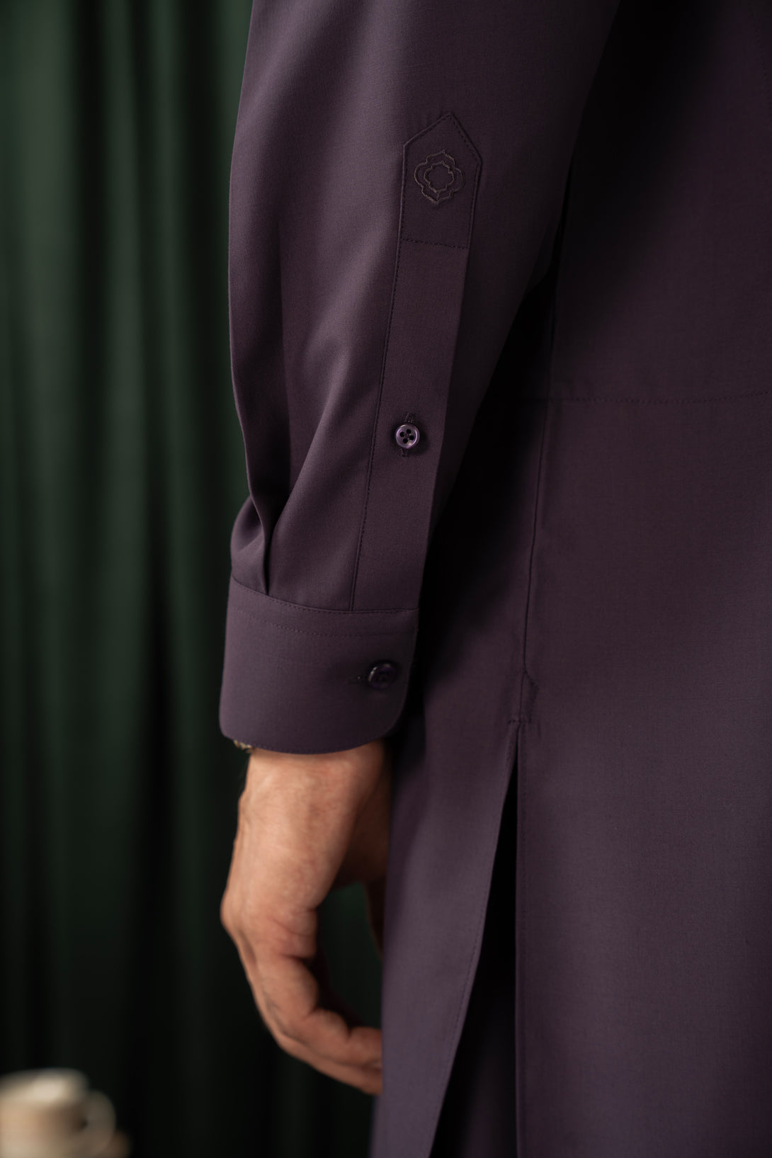 Embroidered Mashriq motif on cuff.