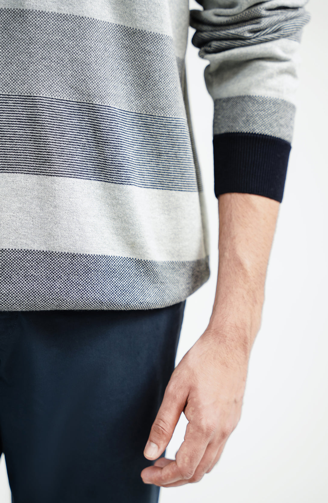 - Finished with ribbed neckline, cuffs, and hem