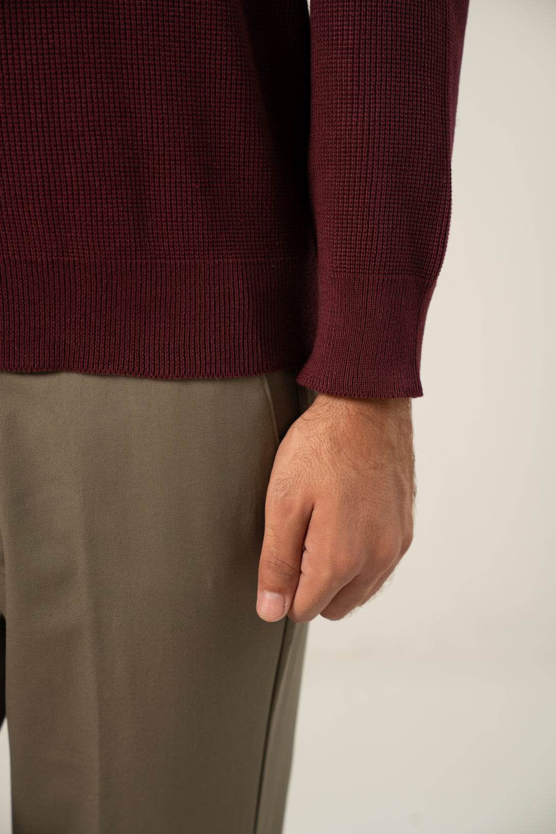 - Features a textured knit and ribbed trims