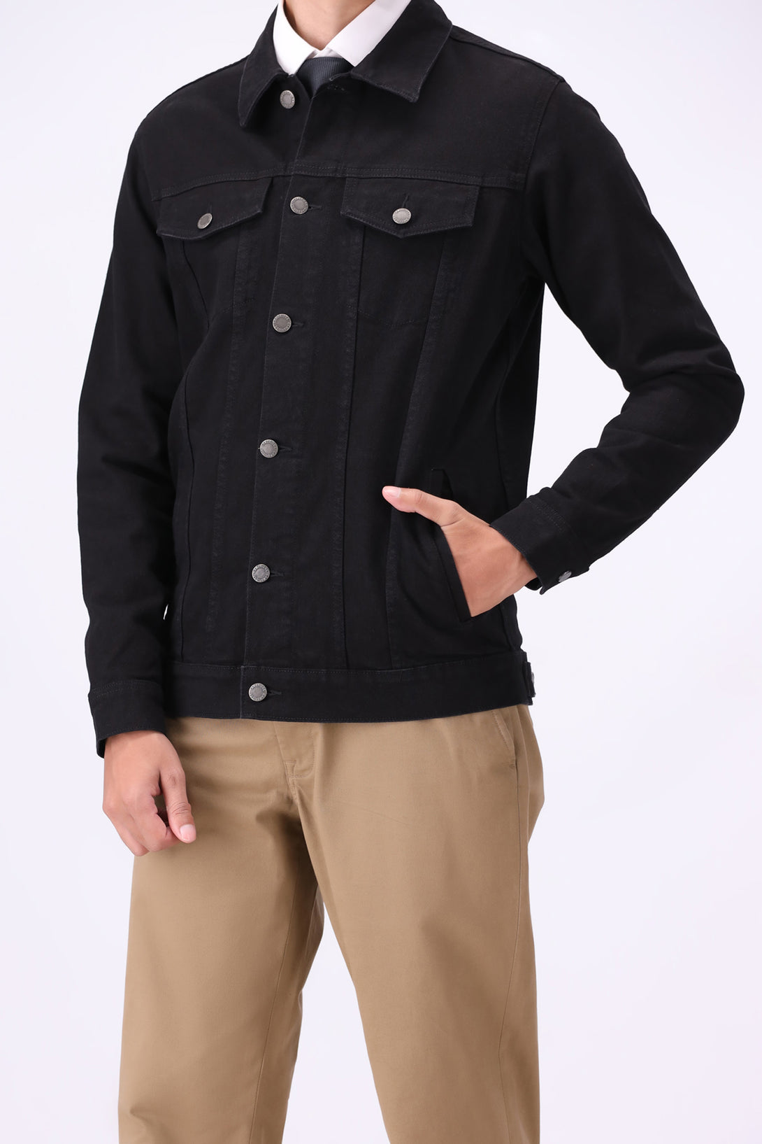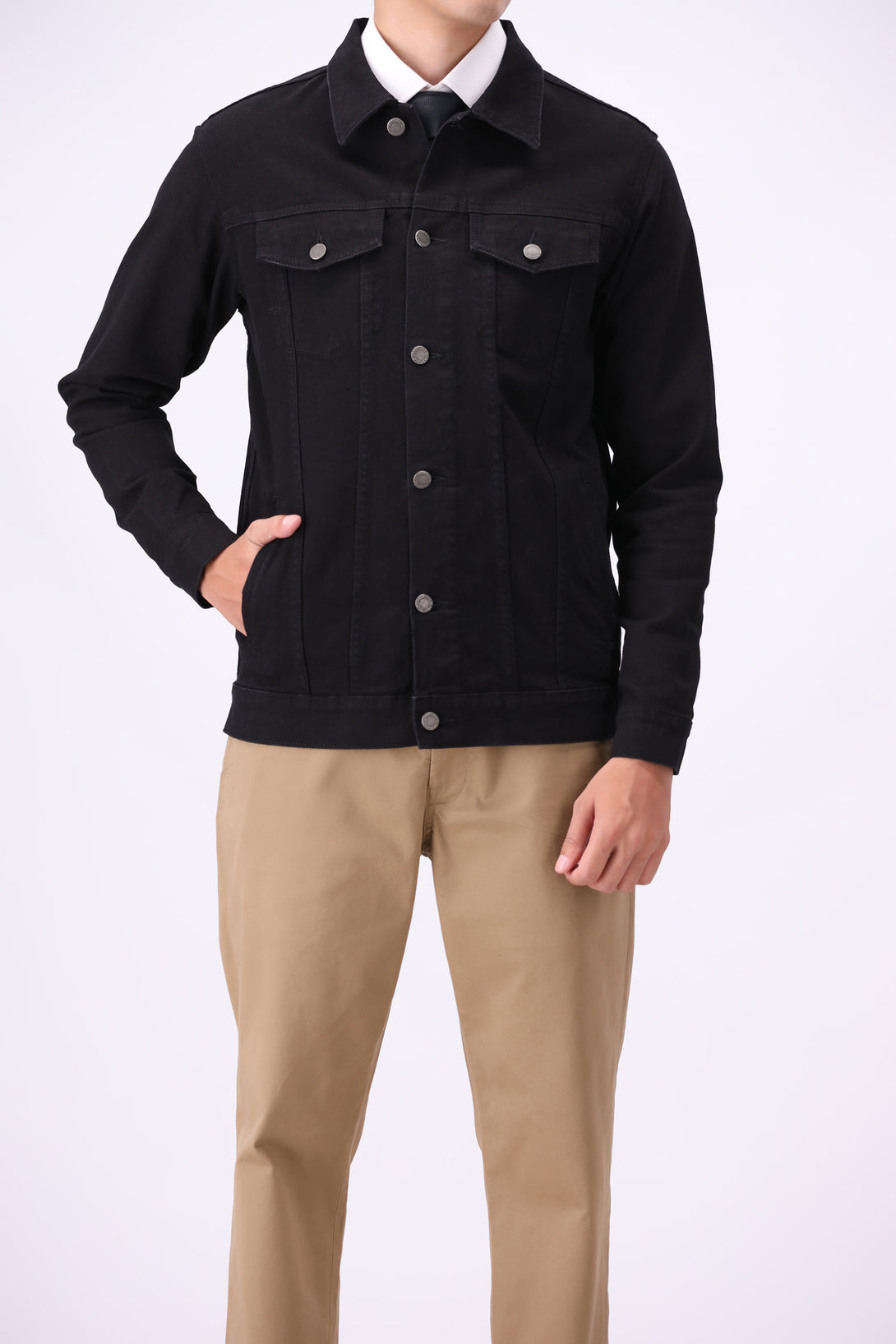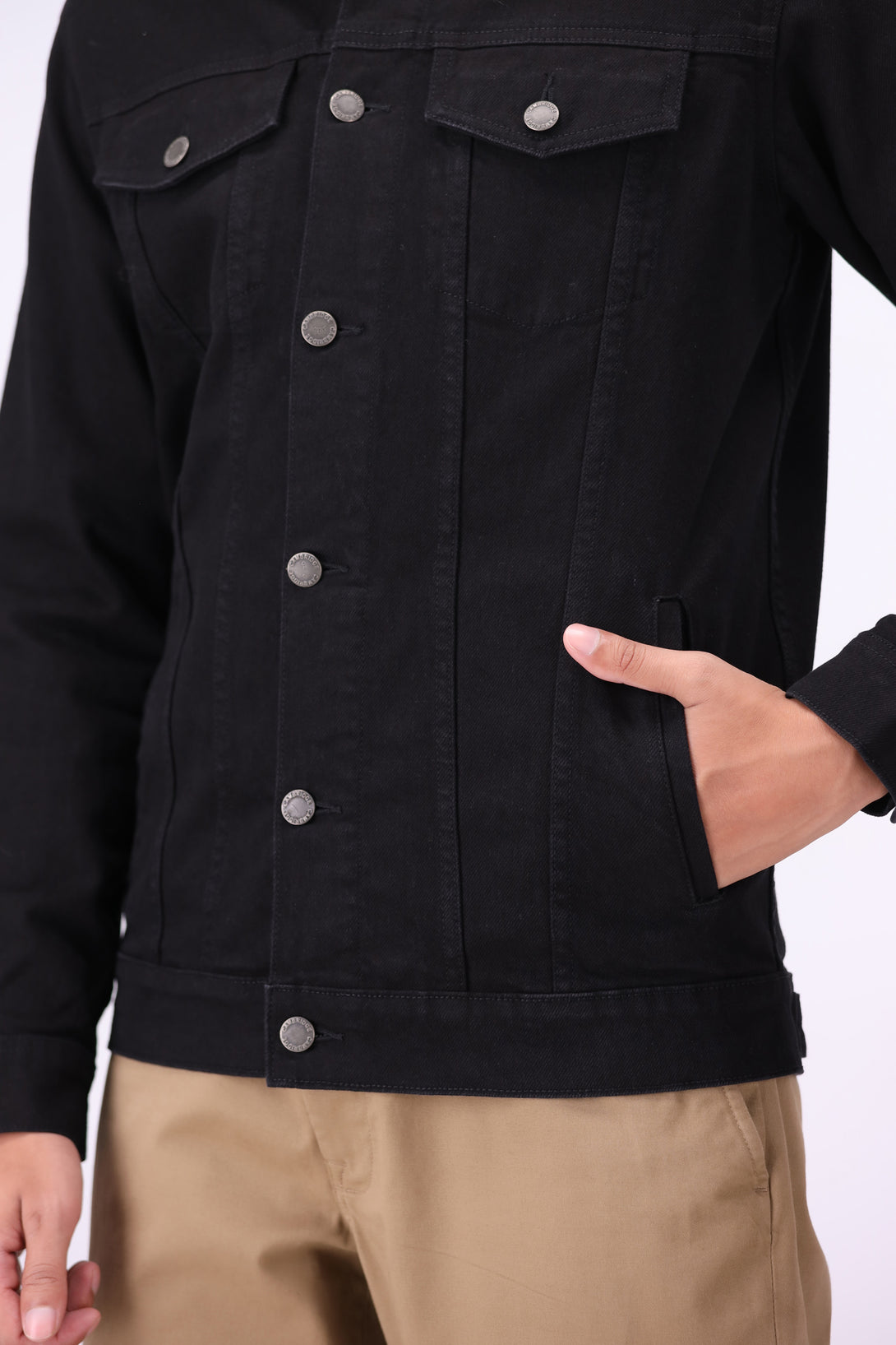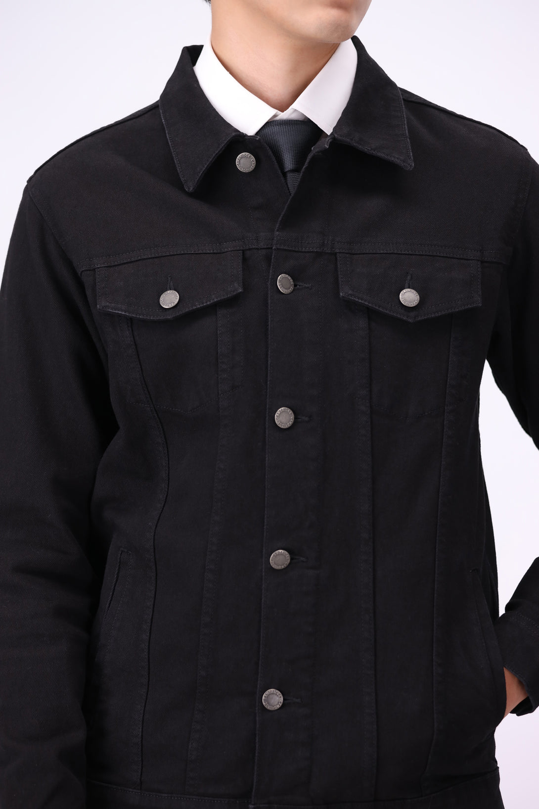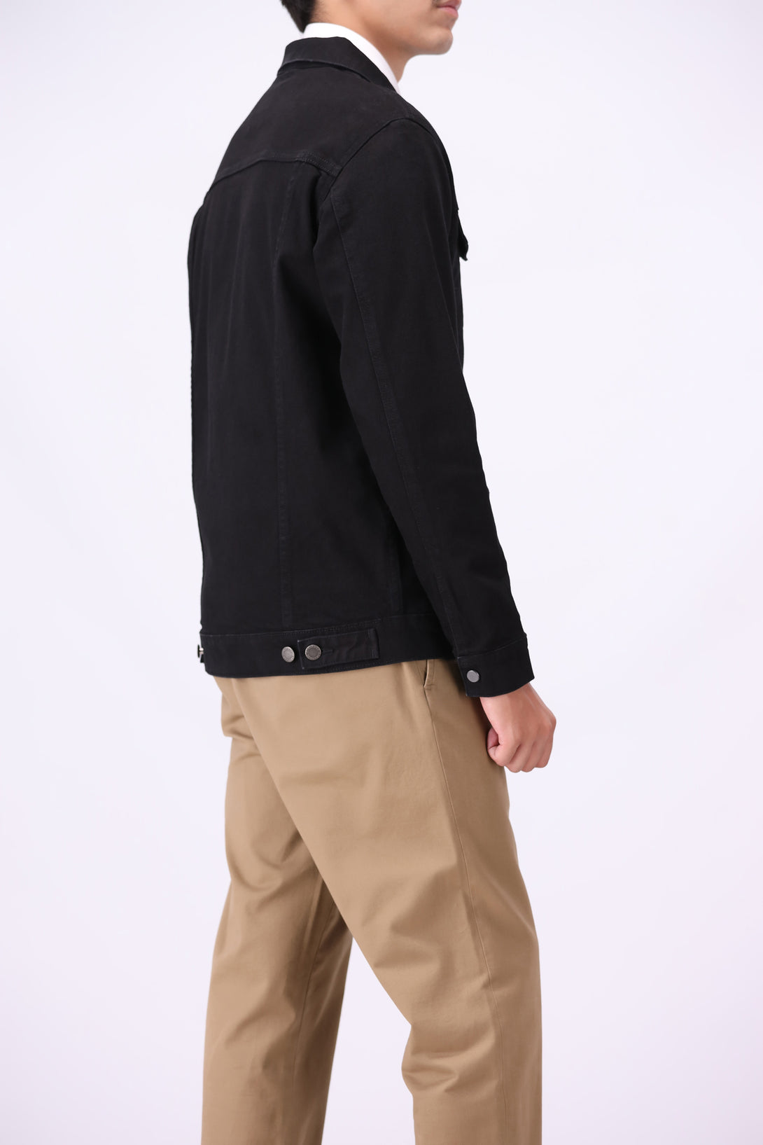 - Rinse-washed black denim jacket for a deep-toned finish