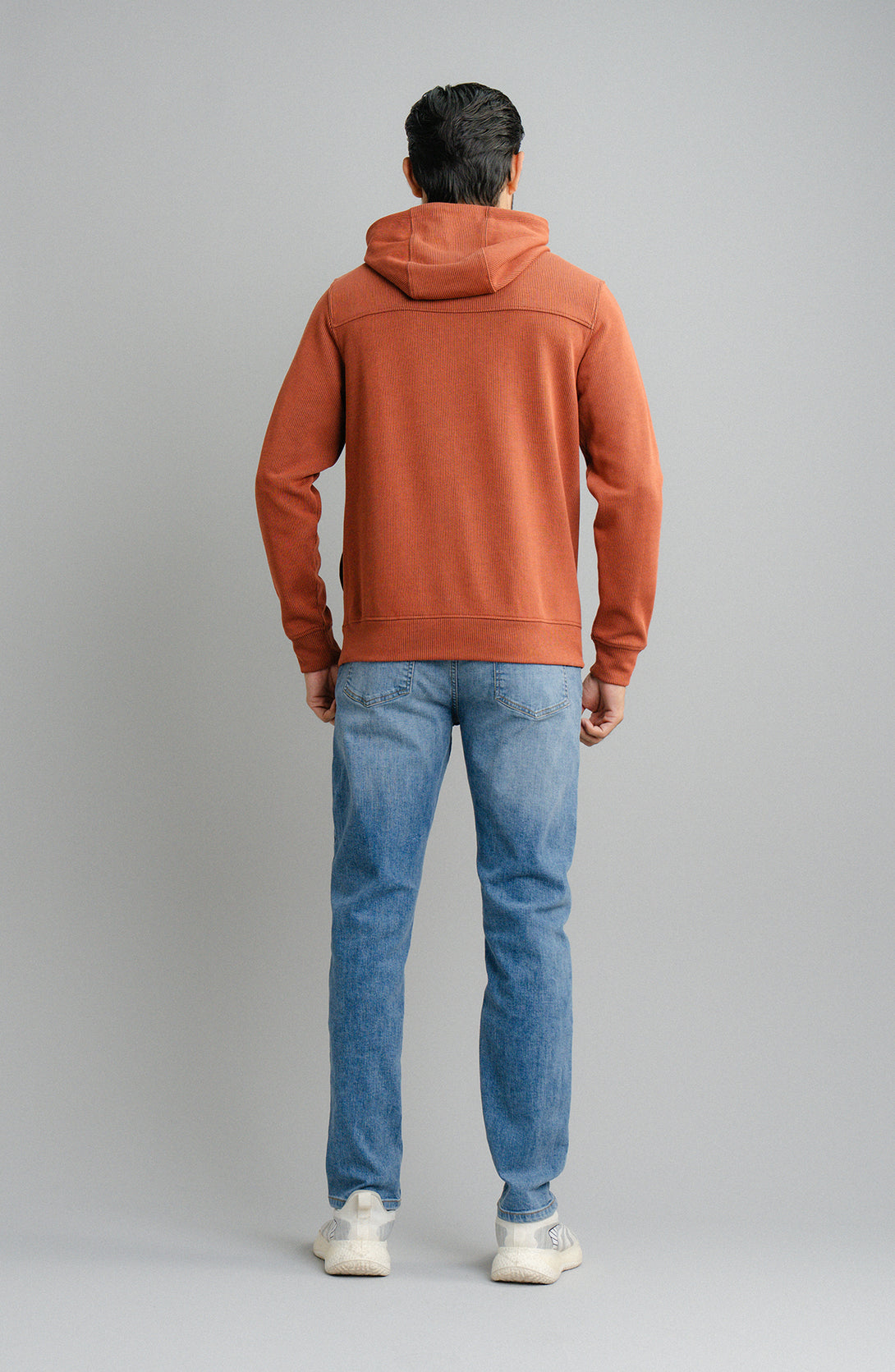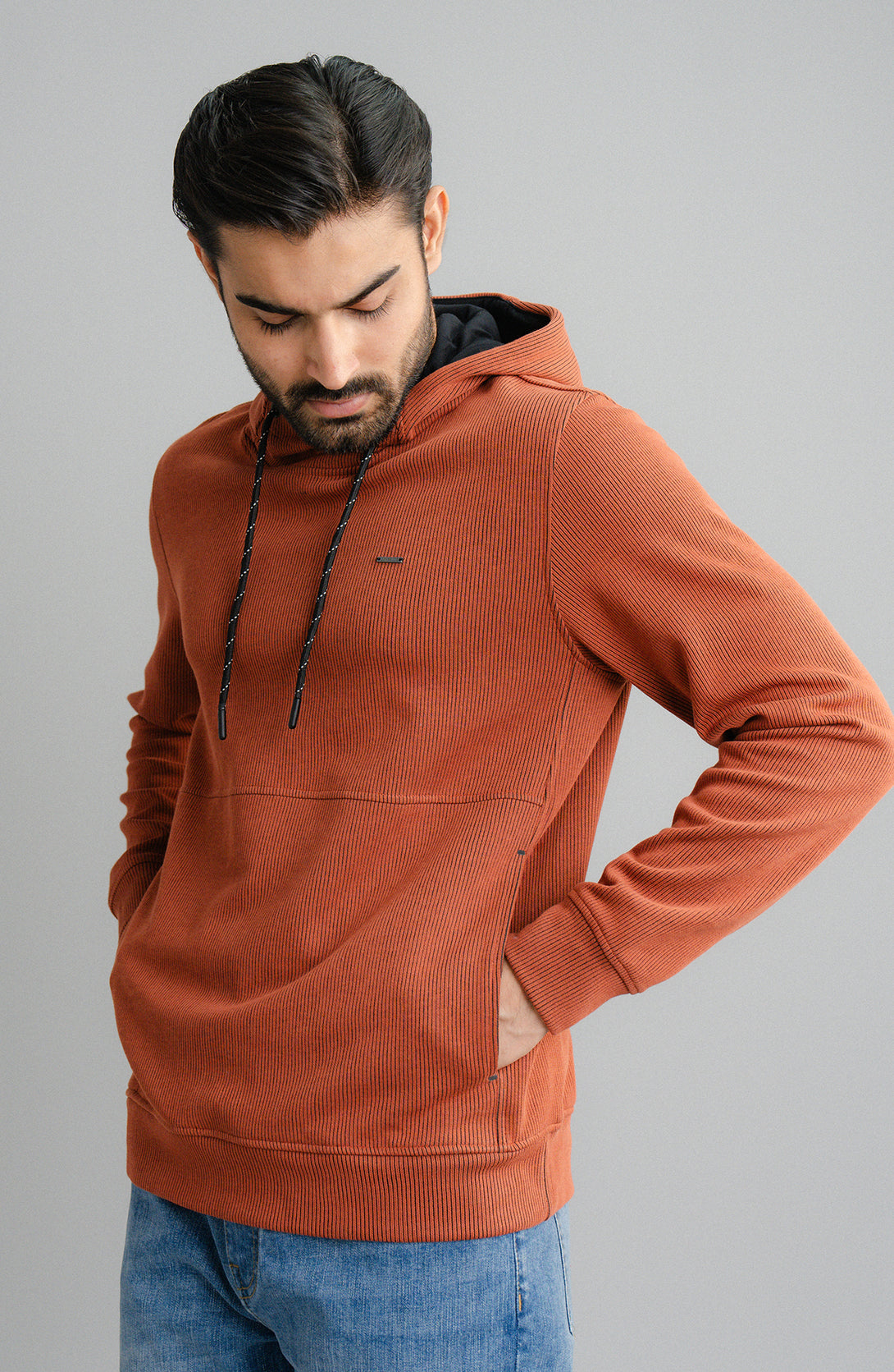 Immerse yourself in style and comfort with this essential hoodie pullover, made with flat back textured rib fabric. Featuring kangaro pockets and a regular fit, it’s a perfect addition to your casual winter outfits.